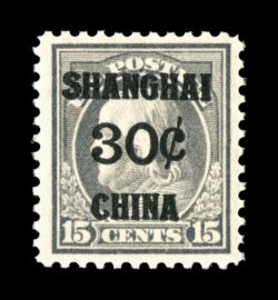 959 Ou K12 image#K12, 30c on 15c Gray, a fresh and choice used single, featuring intensely deep color and a prooflike impression on bright paper, exceptionally well centered within large balanced margins, neat portion of Shanghai Postal Agency c.d.s., extremely fine; 2006 PF certificate (XF 90; SMQ $370.00). (Image) $140.00