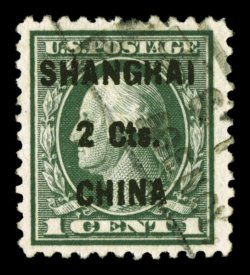 963 Ou K17 image#K17, 2c on 1c Green, locally surcharged, highly select used single, wonderfully well centered within very large margins, deep luxuriant color on bright fresh paper, neat boxed cancel of the Shanghai Postal Agency, extremely fine; quite elusive to find both used and this choice; 2006 PF certificate (VF-XF 85; SMQ $205.00); this is the highest graded used example that we are aware. (Image) $140.00