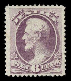 965 og O28 image#O28, 6c Justice, fresh mint single, featuring extraordinarily wide margins and being exceptionally well centered within them, bright color and a clean crisp impression on fresh paper, full clean o.g., lightly hinged, extremely fine; very scarce in this choice quality; 2004 PF certificate. (Image) $230.00
