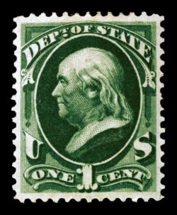966 og O57 image#O57, 1c State, excellent centering within large margins, deep luxuriant color and a crisp detailed impression, full o.g., extremely fine; 2004 PSE certificate. (Image) $200.00