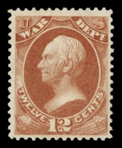 967 ogu O89 image#O89, 12c War, exceptionally fresh, with lovely rich color on clean white paper, well centered within large margins, o.g., relatively lightly hinged, very fine and choice; 2004 PSE certificate (VF 80; SMQ $300.00). (Image) $200.00