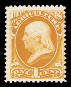 969 og O94 image#O94, 1c Agriculture, on soft porous paper, without gum as issued, an especially choice example of a stamp that is both rare and extraordinarily challenging to find fault free, brilliantly fresh, with absolutely radiant color on bright paper, quite well centered with mostly exceptionally large margins, plus surrounded by unusually full even perforations, completely free of the thins which plague the vast majority of known examples, very fine; an especially elusive soft paper official in this premium condition; 2006 PF certificate. (Image) $5,000.00