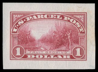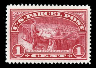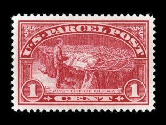979 nhu Q1 image#Q1, 1c Parcel Post, a magnificent quality mint single, featuring mathematically precise centering within lavishly large margins, plus it has gorgeous radiant color and a well incised impression on bright paper, pristine o.g., n.h., superb; 1999 PF certificate and a 2006 PSE certificate (Gem 100; SMQ unpriced in this grade, $700.00 as 98); the highest graded example by the PSE in their population report, and the only copy to have been given this exalted grade. (Image) $14.00