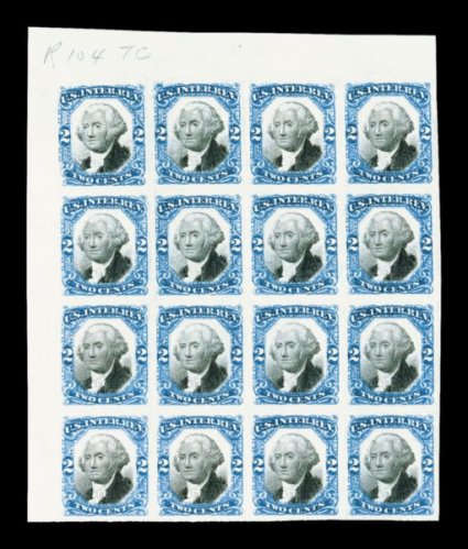 1003 TCbl R104TC5 image#R104TC5, 2c Light blue and black, trial color on bond, top left corner margin block of sixteen (4x4), the other two sides have large to extra-large even margins, fresh, extremely fine and nice position block; cataloged as singles. (Image) $960.00+