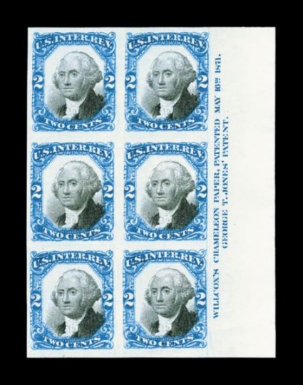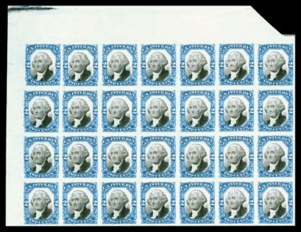 1004 TCbl R104TC5 image#R104TC5, 2c Light blue and black, trial color on bond, impressive top left corner margin block of 28 (7x4), showing a portion of the selvage registration cutout at top, other margins are large and even as well, few minor wrinkles virtually all in the large selvages, very fine and choice block of which few yet remain in this size. (Image) $1,680.00+