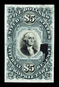 1009 E Turner 119 var. imageTurner Essay 119 var., $5.00 Dark blue green, model from this die essay of the frame on India paper with black cutouts of Washington vignette and "$5" on India pasted on, 68x108mm, both the frame and the cutouts are of the issued designs making a model of the completed design as issued, damaged with tears at right and a piece of the frame at right missing, nevertheless very rare and probably unique; unlisted in Turner and there was no example in Joyce. (Image) Est. 300-400