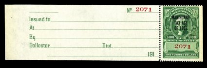 1010 nh RJM1-4 image#RJM1-4, 1937 $1.00 Yellow green, $5.00 Blue, $10.00 Yellow orange and $100.00 Green cplt., the last with receipt tab and without gum as issued, bright colors and fresh, the $5.00 Blue has a natural straight edge at bottom (a normal occurrence as two out of every five stamps of the low values have straight edges), fine-very fine; this series of stamps has only been recently listed in Scott since they have only reached collectors hands through the sale of the revenue archives by the National Postal Museum of the Smithsonian Institution; a very scarce set with a total of only 500 sets released. (Image) Est. 750-1,000