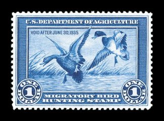 1012 nh RW1 image#RW1, 1934 $1.00 Blue, an exquisite gem mint single, being perfectly centered within large balanced margins, brilliantly fresh, o.g., n.h., extremely fine; a particularly select example; 1995 PF certificate. (Image) $800.00