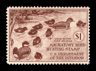 1014 nh RW7 image#RW7, 1940 $1.00 Sepia, select mint single, excellent centering within large margins, rich color and a sharp impression, fresh o.g., n.h., extremely fine. (Image) $225.00