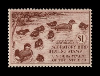 1015 nhu RW8 image#RW8, 1941 $1.00 Brown carmine, excellent centering within large margins, strong rich color, pristine o.g., n.h., extremely fine; 2006 PF certificate (XF 90; SMQ $380.00); in our opinion a conservative grade. (Image) $225.00