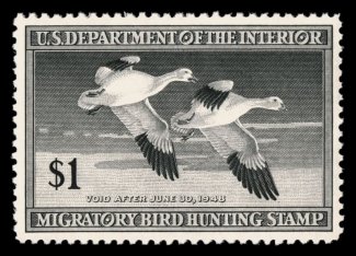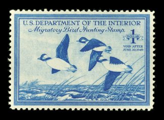 1018 nhu RW15 image#RW15, 1948 $1.00 Bright blue, excellent centering, wonderfully bright and fresh, o.g., n.h., extremely fine; 2006 PSE certificate (XF-Superb 95; SMQ $170.00). (Image) $52.50