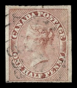 1101 O 8a image#8a, 1857 1/2p Rose, on horizontally ribbed paper, four ample to large margins, bright color and sharp impression, lightly cancelled with scarce c.d.s. postmark showing an 1858 year date, small thin specks, very fine appearance and a scarce stamp (Unitrade C$3,500.00). (Image) $2,250.00