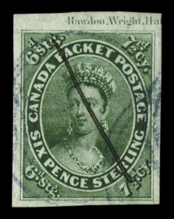 1103 O 10 image#10, 1857 6p Reddish purple on very thick soft paper, attractive used example of this extraordinarily scarce issue, deep purple color without as much red, which is often referred to as the "cold" shade, sharp impression, well clear to large margins all around, centrally struck blue numeral "5" in three-ring cancel of Brantford, very fine; 1987 Greene Foundation certificate (Unitrade C$7,500.00). (Image) $3,500.00