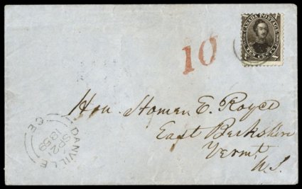 1105 c 16 image#16, 10c Black brown, perforated 11 3/4, attractive single with intense deep color and sharp impression of the first printing, typical fine centering, tied to choice 1859 cover to East Berkshire, Vermont via Montreal by target cancel, matching clear "Danville/CE/SP 21 1859" small double-arc c.d.s., on the reverse are two strikes of "Mon. & Isld. Pd Grand Tr'k R'way/No. 5/Sep 21 1859" railroad transits, bold red "10" cross border rate marking, a very fine and rare cover; 1980 PF certificate (Unitrade on cover C$6,000.00). (Image) Est. 2,000-3,000