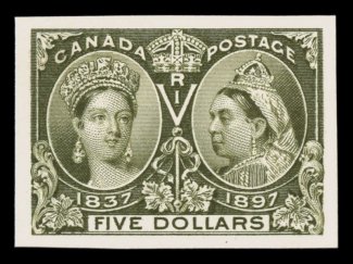 1107 P Unitrade #50P-65P imageUnitrade #50P-65P, 1897 1c-$5.00 Jubilees, plate proofs on card, gem set of beautifully matched proofs, lavish margins, brilliant strong colors, plus the card is also pristine having never been mounted, extremely fine; premium sets, such as this, are quite rare with as few as only 400 known of the $1.00 value. (Image) Unitrade C$5,350.00