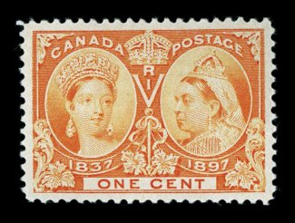 1109 nh 51 image#51, 1897 1c Jubilee, choice mint single, possessing exceptionally large and remarkably well balanced margins all around, radiant color, o.g., n.h., an extremely fine gem; 2005 Greene Foundation certificate (Unitrade C$90.00). (Image) $50.00