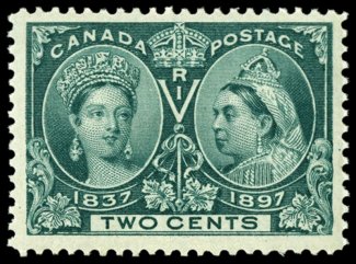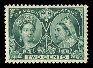 1111 nh 52 image#52, 1897 2c Jubilee, exceptionally well centered within extraordinarily large margins, sumptuously rich color and a detailed impression, o.g., n.h., extremely fine (Unitrade C$105.00). (Image) $55.00