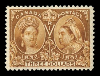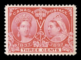 1112 nh 53 image#53, 1897 3c Jubilee, a gem mint example, flawlessly centered within large and perfectly balanced margins, brilliant color, pristine o.g., n.h., extremely fine (Unitrade C$75.00). (Image) $37.50