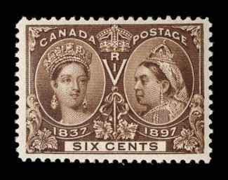 1115 nh 55 image#55, 1897 6c Jubilee, unusually well centered and margined, strong rich color and a crisp detailed impression, o.g., n.h., extremely fine; 2005 Greene Foundation certificate (Unitrade C$900.00). (Image) $500.00