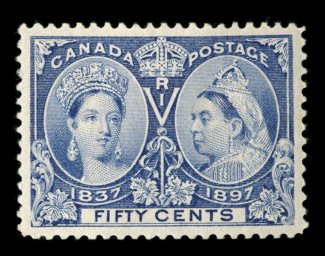1116 og 60 image#60, 1897 50c Jubilee, precisely centered within lavishly large margins, rich color and a clean impression on fresh paper, o.g., mild h.r., extremely fine (Unitrade C$325.00). (Image) $210.00