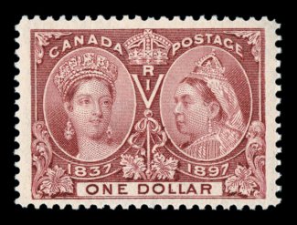 1117 nh 61 image#61, 1897 $1.00 Jubilee, an extraordinarily choice mint example of this popular stamp, being exceptionally well centered amid extraordinarily large margins, rich luxuriant color and a sharp detailed impression, pristine o.g., never hinged, extremely fine; a rare stamp in this superior quality; 2000 PF certificate (Unitrade C$3,600.00). (Image) $2,150.00