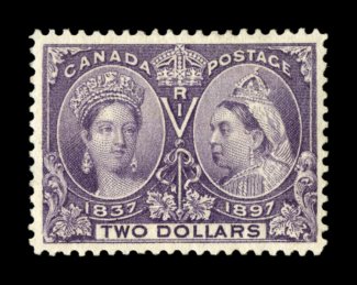 1118 ng 62 image#62, 1897 $2.00 Jubilee, attractive unused single, regummed, exceptionally well centered within large margins, vividly rich color, very fine; 2006 APS certificate (Unitrade C$1,800.00). (Image) $1,200.00