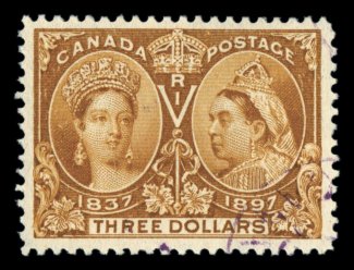 1120 O 63 image#63, 1897 $3.00 Jubilee, lovely used example, being exceptionally well centered amid large margins, sumptuously rich color, light violet cancels leaving the Queens' heads cancel free, extremely fine; 1984 PF certificate (Unitrade C$1,500.00). (Image) $950.00