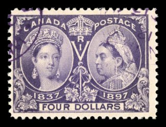 1121 O 64 image#64, 1897 $4.00 Jubilee, strong rich colors, neat unobtrusive violet cancels, nearly very fine (Unitrade C$750.00). (Image) $500.00