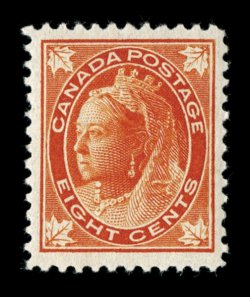 1122 nh 72 image#72, 1897 8c Orange "Maple Leaf", exceptionally well centered within very large margins, gorgeous vivid color and impression on fresh white paper, pristine o.g., n.h., extremely fine; 2006 Greene Foundation certificate (Unitrade C$750.00). (Image) $450.00