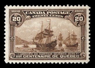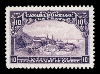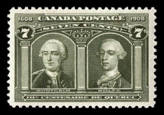 1130 nh 100 image#100, 1908 7c Quebec Tercentenary, excellent centering within uncommonly large margins, strong rich color, o.g., n.h., extremely fine; 1997 APS certificate (Unitrade C$600.00). (Image) $310.00