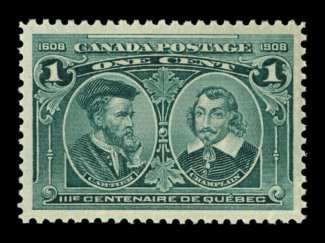1128 nh 97 image#97, 1908 1c Tercentenary, gem mint single, flawlessly centered within lavishly large margins, deep intense color and impression on brilliantly white paper, immaculate o.g., n.h., extremely fine (Unitrade C$75.00). (Image) $35.00