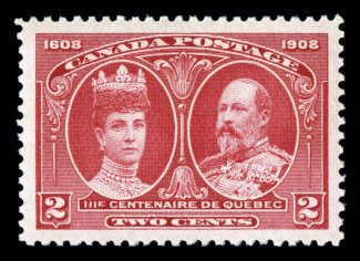 1129 nh 98 image#98, 1908 2c Tercentenary, extraordinarily large and exceedingly well balanced margins all around, deep vibrant color on fresh paper, o.g., n.h., extremely fine; a large-margined gem (Unitrade C$120.00). (Image) $57.50