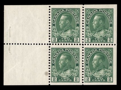 1132 nhBP 107bi imageUnitrade #107bi, 1922 2c Green, booklet pane of four with pyramid guidelines in tab, the guidelines are printed a little light but are clearly visible, strong color, o.g., n.h., light translucent stain at bottom right of tab, otherwise a very fine example of this extremely rare booklet pane; 2005 Greene Foundation certificate. (Image) Unitrade C$8,400.00
