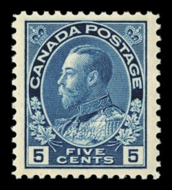 1133 nh 111 image#111, 1914 5c Dark blue, a choice mint single, featuring mathematically precise centering amid unusually wide margins, sumptuously rich color and a deeply etched impression, flawless o.g., n.h., extremely fine; 2000 Greene Foundation certificate (Unitrade C$600.00). (Image) $300.00