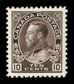1135 nh 116 image#116, 1912 10c Plum, wet printing, a magnificent mint single, being marvelously well centered amid extra-large and perfectly balanced margins, vibrant deep color on fresh white paper exhibiting full even perforations, immaculate o.g., n.h., extremely fine; this is one of the most difficult all the "Admiral" series and truly rare in this superb condition; 1992 Greene Foundation certificate for a block of eight from which this was taken (Unitrade C$975.00). (Image) $575.00