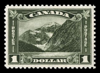 1139 nh 177 image#177, 1930 $1.00 Mt. Cavell, a gem mint single that is flawlessly centered within large balanced margins, lovely rich color, unblemished o.g., n.h., extremely fine; 1995 PSE certificate for a block of four, this being the bottom right stamp (Unitrade C$600.00). (Image) $375.00