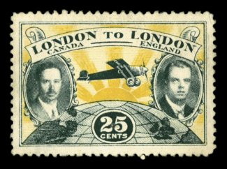 1141 ng Unitrade #CLP6 imageUnitrade #CLP6, 1927 25c London (Ontario) to London (England) flight, a magnificently centered unused example of this world-class air post rarity, possessing large balanced margins all around, the dark green and yellow colors are strong and bright, accompanying certificate states some light soiling, which is truly minimal, and thin spot at bottom left, neither of which detracts from this stamp's extremely fine appearance; actually this example is in a much higher quality and of more attractive appearance than the majority of the very few copies in private hands. The history of this rarity and the tragic flight that brought it about is most fascinating (see the recent issue of "Scott Stamp Monthly" for the story of this flight). The owners of the Carling Brewing company decided to sponsor an aviation competition as a publicity project. The company supplied a state-of-the-art airplane named the "Sir John Carling" and selected Captain Terrence B. Tully and Lieutenant James Medcalf as the pilots, who would receive a prize of $25,000.00 if they successfully completed the flight from London, Ontario to London, England. The attempts went badly from the start. An attempt on August 29, 1927 from London, Ontario was turned back because of bad weather. The second attempt was made from St. John's, Newfoundland on September 7, 1927. The plane departed with 300 gallons of fuel and the mail they had brought from the original attempt in London. Inexplicably, in weather that was described as good and favorable, the "Sir John Carling" completely disappeared somewhere over the Atlantic and no wreckage was ever found.The rarity of this semi-official air post stamp is tied to the fate of this doomed transatlantic attempt. Only 100 of the special stamps were issued. Needless to say, the vast majority were used on covers that were lost with the plane (one cover, which was overlooked or removed from the mail after the first attempt, is known). Since then only nine mint or unused examples have ever been recorded, the example offered here being the ninth and newest discovery. Two of these are in philatelic collections of the British Library and are not available to collectors. Only one premium mint corner margin single is known, last selling in 1971. Of the remaining six examples all have faults or are poorly centered, or both. This new discovery is, by far, the most attractive of these six with its impeccable centering. A great air mail rarity that is ideally suited for exhibition. Accompanied by 2006 Greene Foundation certificate. (Image) Unitrade C$50,000.00