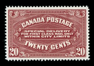 1142 nh E2 image#E2, 1922 20c Carmine special delivery, extraordinarily well centered within large margins, strong rich color, o.g., n.h., extremely fine; 2005 Greene Foundation certificate (Unitrade C$312.50). (Image) $160.00