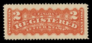1143 og F1a image#F1a, 1875 2c Vermilion registration stamp, brilliant mint single with radiant color of this shade variety, perfectly centered within extra-large lavish margins, fresh o.g., very lightly hinged, extremely fine (Unitrade C$170.00). (Image) $100.00