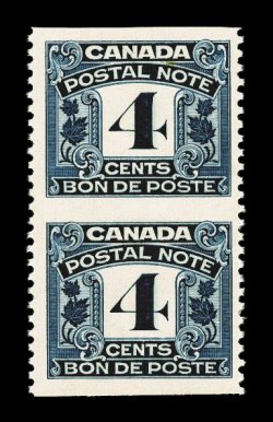 1144 nh FPS6a imageVan Dam #FPS6a, 1932 4c Blue Postal Note, vertical pair, imperforate horizontally, an immaculate mint example of this very scarce and seldom offered error, deep prooflike color and impression on pristine white paper, o.g., n.h., very fine. (Image) Van Dam C$500.00