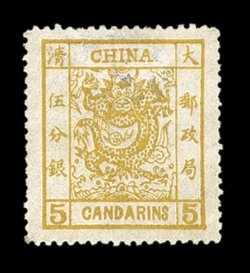 1146 og 6 image#6, 1882 5ca Orange yellow, pelure paper, cliche 4, beautifully centered, full perforations, rich color in this dull yellow shade, certificate states "without gum" though it clearly has part o.g., small thinning at top and neatly repaired at top left, extremely fine appearance; this is the by far the rarest of the Large Dragon issues, with nearly all mint/unused examples having faults to some degree due to the fragile pelure paper; 2006 China Philatelic Society certificate (Chan #6; $16,500.00). (Image) $9,500.00