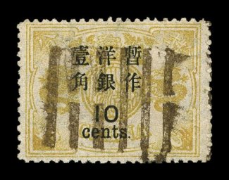 1147 O 45 image#45, 1897 10c Large numeral surcharge with wide spacing on 12ca Dowager first printing, well centered used example of what is undoubtedly the scarcest value of the wide large numeral surcharges on either printing, color just slightly faded, complete Hangchow pakua cancel in brown, very fine appearance; a rare stamp that is virtually unobtainable in mint condition; 2005 Experts & Consultants certificate (Chan #54; $2,000.00). (Image) $2,500.00