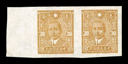 1152 og 496 var. image#496 var., 1942 30c Dull vermilion, Central Trust printing on thin Chinese wood free paper, imperforate, horizontal pair with left sheet margin, unused, without gum as issued, wide margins all around, fold in selvage well away from stamp, extremely fine pair; listed but unpriced in Chan; signed S.C. Veen (Chan #588b). (Image) Est. 200-300