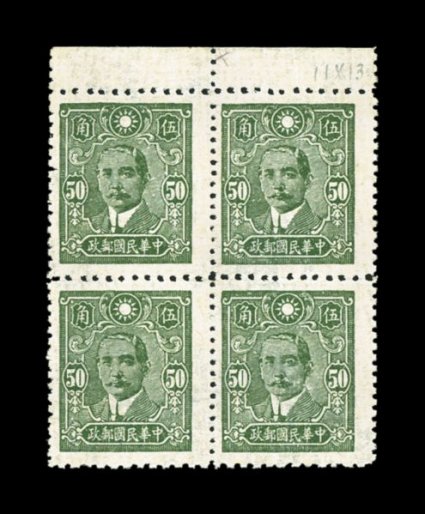 1153 ogbl 498 var. image#498 var., 1942 50c Sage green, Central Trust printing on native paper with lines, compound perf. 11x13, top sheet-margin block of four, unused, without gum as issued, excellent color, fresh, very fine and scarce perforation variety; not listed in Scott; signed S.C. Veen (Chan #576a). (Image) Chan $720.00