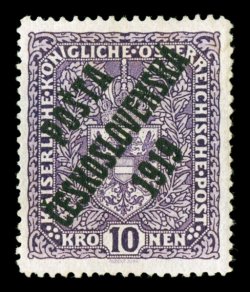 1154 og B21 image#B21, 10K Violet, with "Posta/Czechoslovakia/1919" overprint, Ty. I, fresh mint single, well centered and possessing deep color and sharp impression, o.g., very lightly hinged, very fine; signed Gilbert, Pofis (Michel #54b; €400). (Image) $300.00