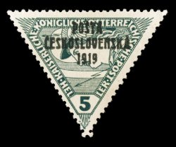 1155 nh B33 image#B33, 5h Deep green on yellow with "Posta/Ceskoslovenska/1919" overprint, Ty. II, exceptionally fresh example of this scarce and popular triangular value, o.g., never hinged though very faint fingerprint, very fine; signed Gilbert, Pofis (Michel #68; €1,300 for hinged). (Image) for hinged $1,200.00