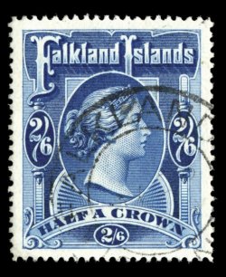 1160 O 20-21 image#20-21, 1898 2/6 Dark blue and 5/- Brown red cplt., attractive used examples of this pair of key high values, each with excellent color on bright white paper, double circle "Falkland/Islands" c.d.s. postmarks, very fine (S.G. #41-42; £475). (Image) $575.00