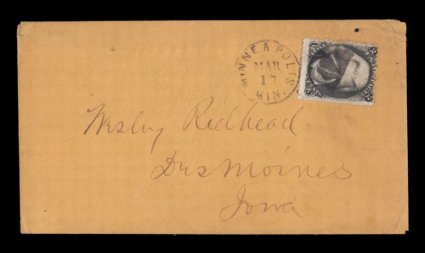 101 c 84 image#84, 2c Black, "D" grill, single with natural straight edge at right, tied to circular rate cover to Des Moines, Iowa by "Minneapolis/Min/Mar. 17" (1868) duplex, insurance enclosure, stamp with typical centering being just into the design at top, minor water staining to the cover, fine usage; this rare grill is exceedingly rare on cover, much more so than the modest premium given for an on-cover usage, most "D" grills were not discovered until they were removed from the cover; this is one of the few examples that has a well impressed grill that is easily discernable from the face and therefore remains on the cover; 1988 PSE certificate. (Image) $4,750.00