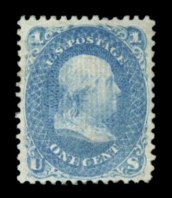 104 og 86 image#86, 1c Blue, "E" grill, an extraordinary mint example of this very scarce grilled stamp, possessing overall physical characteristics which are largely unheard of on any of the grilled issues, let alone this particularly difficult stamp, featuring an extraordinary overall freshness, with gorgeous bright color and a strong impression on immaculate paper, marvelously well centered amid large margins, pristine full o.g. that has been very lightly hinged, extremely fine; a remarkable condition rarity for the finest collection; 2004 PF certificate. (Image) $3,500.00