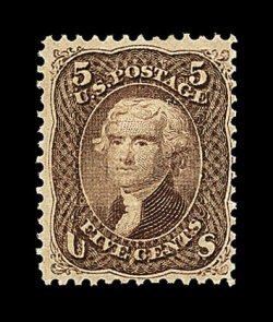 108 nh 95 image#95, 5c Brown, "F" grill, a brilliant "post office" fresh mint example, possessing an overall mint "bloom" that is rarely encountered on stamps of this vintage, with rich luxuriant color and a strong impression, quite well centered, brilliant full o.g. which shows the grill impression perfectly, never hinged, just a trace of slight offset as often found on the small existing population of never hinged examples, very fine and exceedingly choice; few Five Cent "F" Grills exist in such pristine condition, those that do come from a small group of multiples that were found in the past decade and have been broken up to satisfy the demand for premium quality singles, virtually every example from this cache has some trace of slight offset on the reverse; 1992 PF certificate; ex-Lessin. (Image) for hinged 3,500.00